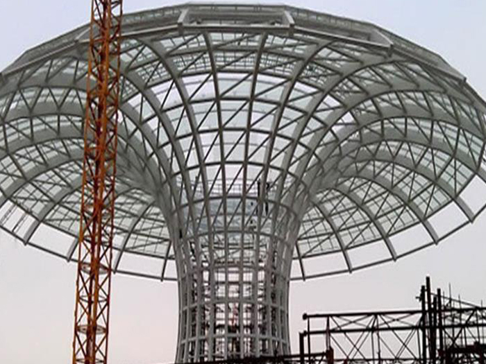 二、球形网架结构因其结构新颖,受力合理,自重轻、用钢量低等优点。如大型体育场馆球形原平螺栓球网架、公共场馆球形网架、电厂原平螺栓球网架、水泥工业球形网架、仓储物流球形网架、原平干煤棚工业球形网架、原平收费站原平加油站球形网架、展览中心、影剧院、商场、航站楼、候车厅、工厂原平车间、仓库、电视塔等球形螺栓球节点网架。国内球形网架结构主要分为:原平焊接球节点网架及螺栓球节点网架两种。螺栓球节点网架其构件工厂内加工量较大,现场安装便捷,适用于现场工期紧,原平施工条件、用电量受制约,网架形状复杂、原平杆件定位困难的异形结构。螺栓球节点球形网架系统基本由原平杆件、螺栓球、支撑支座等组成。按照节点形式可分为交叉原平桁架体系、四角锥体系、三角锥体系等。支撑方式多为固定支座支撑。对于大面积、大跨度及有特殊受力或伸缩要求的网架结构可采用橡胶支座、滑移支座、球铰支座等支撑形式,以满足结构自身的受力稳定、均衡,便于内力释放等设计要求。